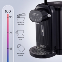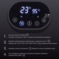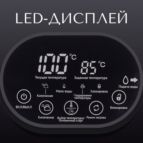 Информативный дисплей покажет вам не только заданный режим, но и температуру в режиме реального времени. Когда вода внутри колбы будет заканчиваться – загорится соответствующий индикатор на дисплее.