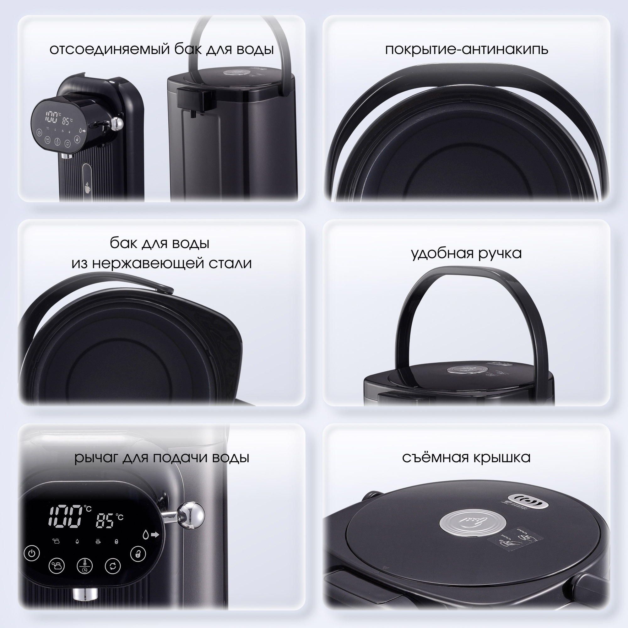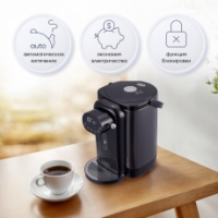 Пользоваться термопотом легко: снимите блокировку подачи воды, а затем опустите рычаг. Как только ваша кружка будет полностью наполнена, просто отпустите рычаг, чтобы остановить поток воды. Все материалы, контактирующие с водой, абсолютно безопасны и экологичны. На внутреннюю колбу из нержавеющей стали нанесено покрытие, препятствующее образованию накипи и ржавчины. Теперь даже при использовании водопроводной воды колбу легко очистить, а съёмная крышка термопота сделает этот процесс еще более удобным.