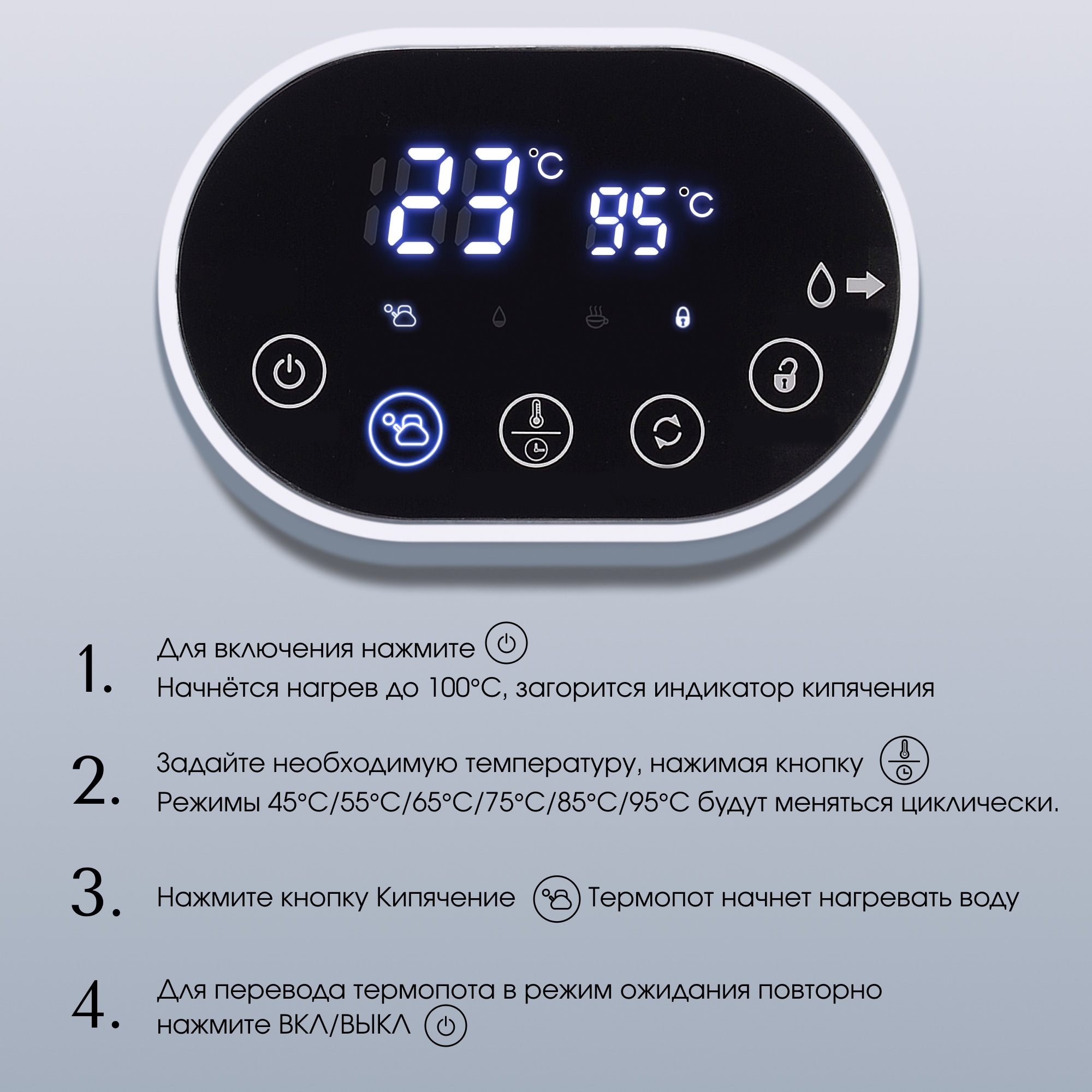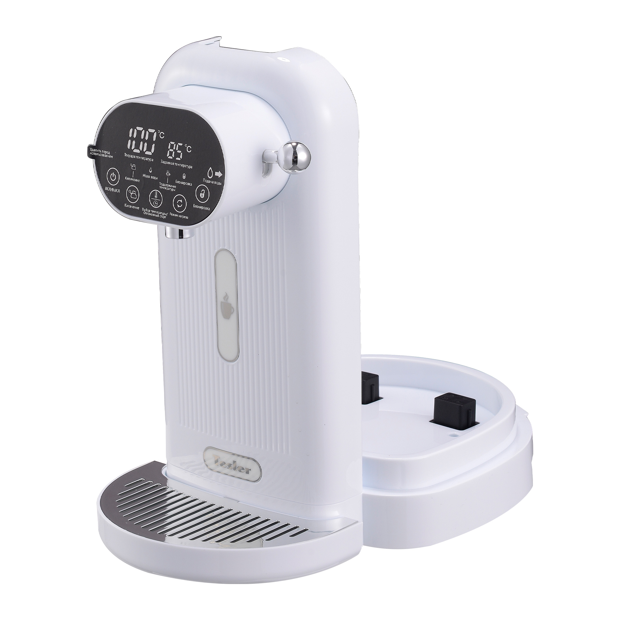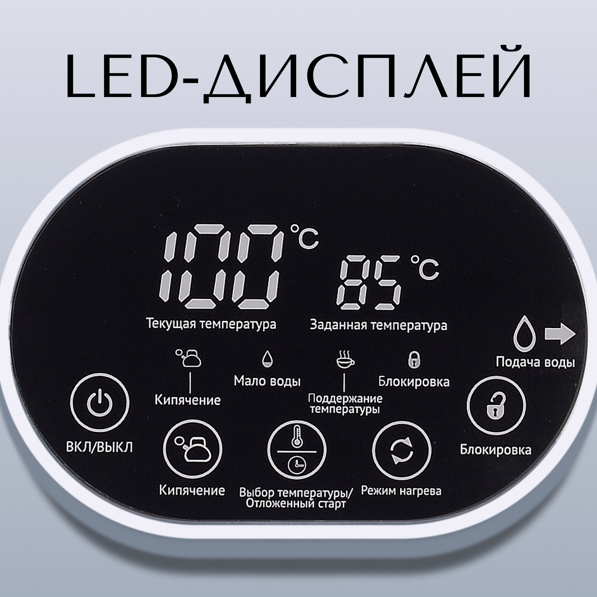 Информативный дисплей покажет вам не только заданный режим, но и температуру в режиме реального времени. Когда вода внутри колбы будет заканчиваться – загорится соответствующий индикатор на дисплее.