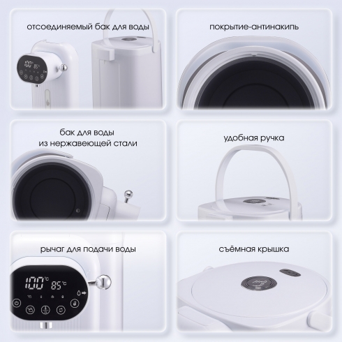 Пользоваться термопотом легко: снимите блокировку подачи воды, а затем опустите рычаг. Как только ваша кружка будет полностью наполнена, просто отпустите рычаг, чтобы остановить поток воды. Все материалы, контактирующие с водой, абсолютно безопасны и экологичны. На внутреннюю колбу из нержавеющей стали нанесено покрытие, препятствующее образованию накипи и ржавчины. Теперь даже при использовании водопроводной воды колбу легко очистить, а съёмная крышка термопота сделает этот процесс еще более удобным.