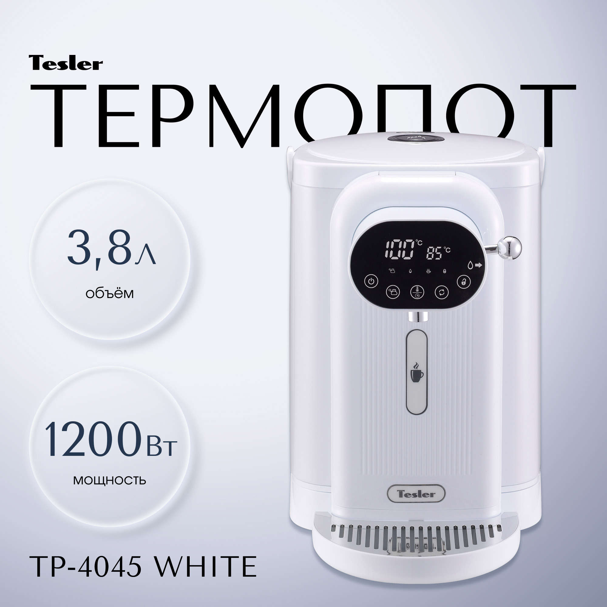Термопот TP-4045 не только кипятит воду, но и нагревает её до одного из шести предустановленных значений (95, 85, 75, 65, 55, 45 градусов). После закипания включится режим поддержания температуры, и вода останется горячей, чтобы вы могли наслаждаться любимыми напитками в любой момент. Качественная термоизоляция препятствует быстрому остыванию прибора даже при отключенном питании. Мощности 1200 Вт достаточно, чтобы вода закипала в считанные минуты. Чтобы сэкономить время и электроэнергию, настройте отложенный старт, установив нужное время начала кипячения.