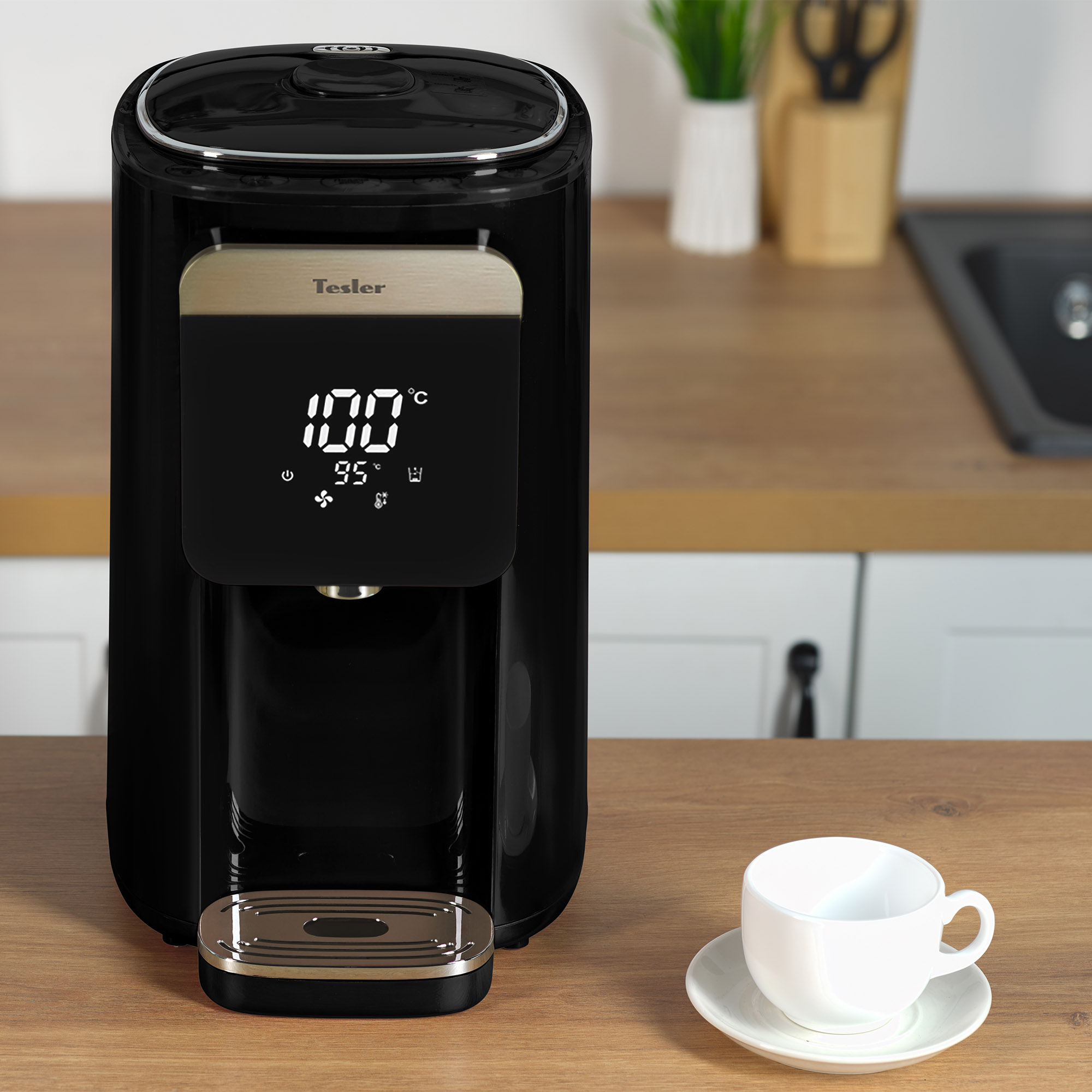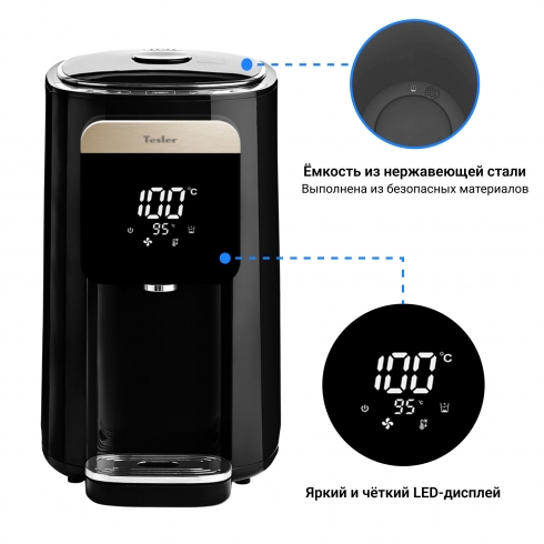 Термопот Tesler Margherita TP-5045 не только кипятит воду, но и нагревает её до одного из шести предустановленных значений (95, 85, 75, 65, 55, 45 градусов). Выбранная температура поддерживается постоянно.