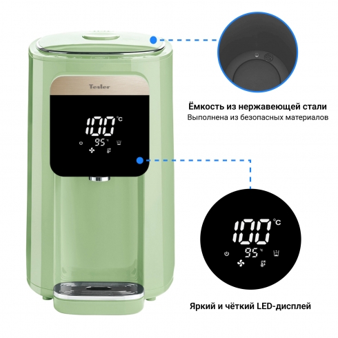 Термопот Tesler Margherita TP-5045 не только кипятит воду, но и нагревает её до одного из шести предустановленных значений (95, 85, 75, 65, 55, 45 градусов). Выбранная температура поддерживается постоянно.