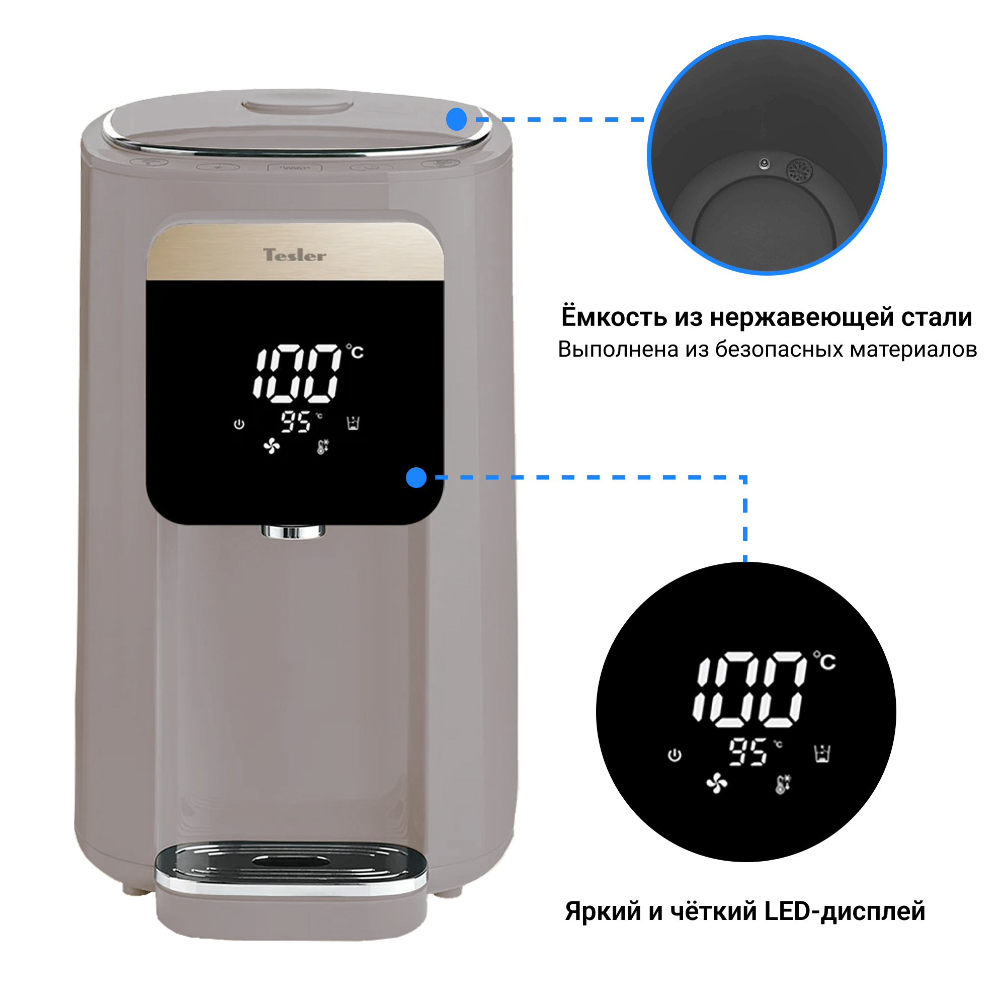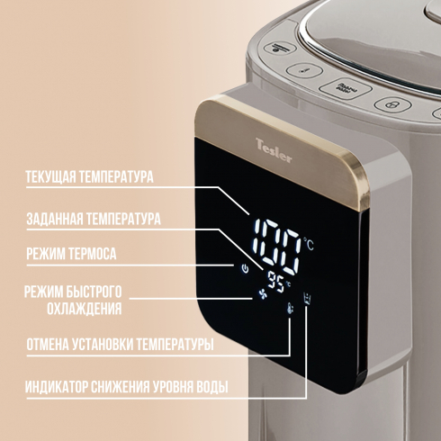 Термопот Tesler Margherita TP-5045 не только кипятит воду, но и нагревает её до одного из шести предустановленных значений (95, 85, 75, 65, 55, 45 градусов). Выбранная температура поддерживается постоянно.