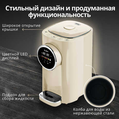 Прибор обладает мощностью 1200 Вт, за счёт чего быстро доводит до кипения объём воды в 5 литров. На информативном дисплее отображаются текущая температура и выбранный режим. При понижении уровня воды термопот подаёт звуковой сигнал, при необходимости подачу воды можно заблокировать для безопасности.