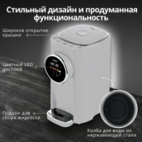 Прибор обладает мощностью 1200 Вт, за счёт чего быстро доводит до кипения объём воды в 5 литров. На информативном дисплее отображаются текущая температура и выбранный режим. При понижении уровня воды термопот подаёт звуковой сигнал,  при необходимости подачу воды можно заблокировать для безопасности.