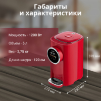 Прибор обладает мощностью 1200 Вт, за счёт чего быстро доводит до кипения объём воды в 5 литров. На информативном дисплее отображаются текущая температура и выбранный режим. При понижении уровня воды термопот подаёт звуковой сигнал, при необходимости подачу воды можно заблокировать для безопасности.