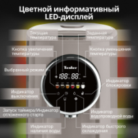 Прибор обладает мощностью 1200 Вт, за счёт чего быстро доводит до кипения объём воды в 5 литров. На информативном дисплее отображаются текущая температура и выбранный режим. При понижении уровня воды термопот подаёт звуковой сигнал, при необходимости подачу воды можно заблокировать для безопасности.