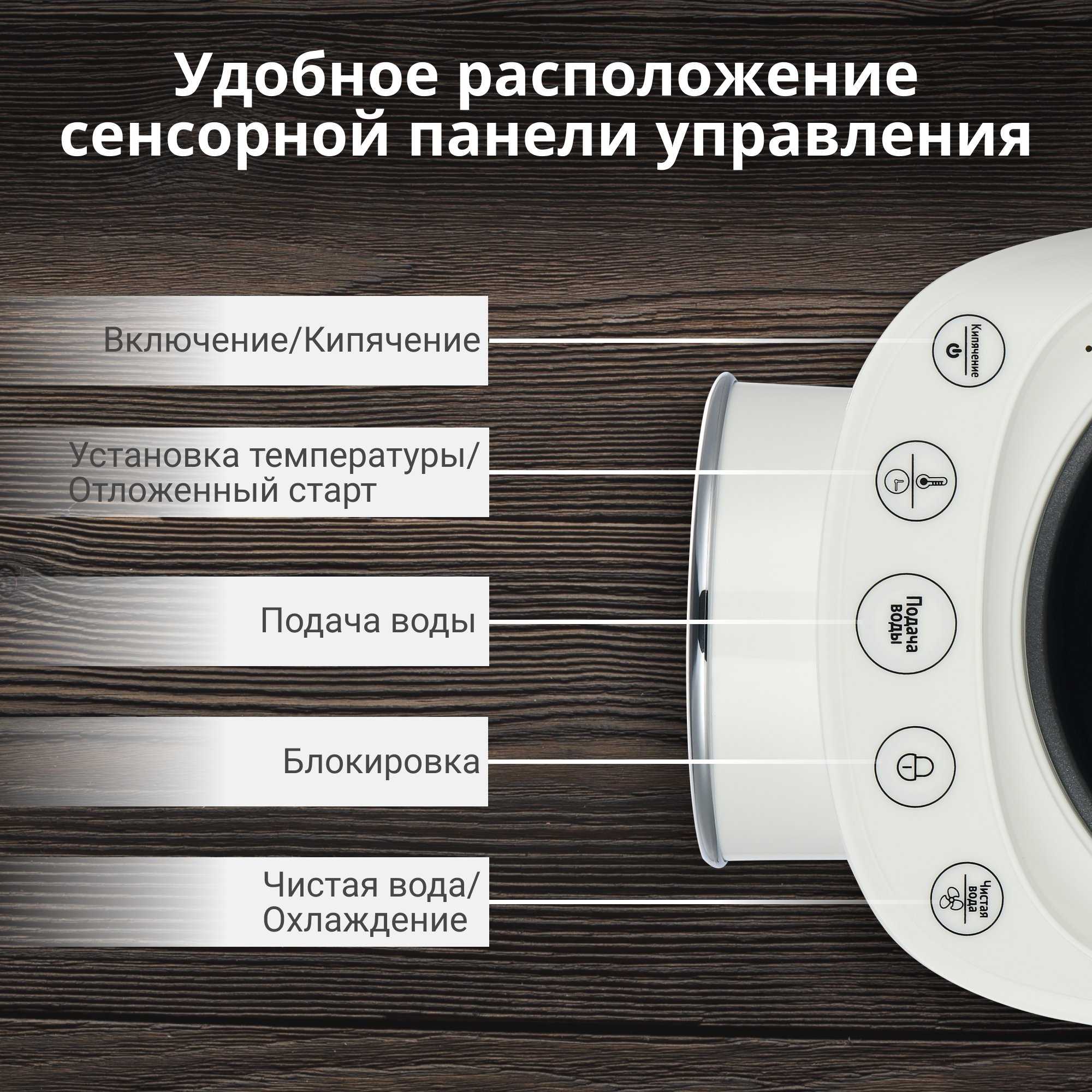 Функция быстрого охлаждения позволяет оперативно снизить температуру воды до нужного уровня сразу после кипячения. Все детали, соприкасающиеся с водой, выполнены из безопасных и экологичных материалов. Внутренняя колба из нержавеющей стали имеет специальное покрытие, предотвращающее образование накипи и коррозии, что особенно важно при использовании обычной водопроводной воды. Уход за прибором упрощается благодаря съёмной крышке.
