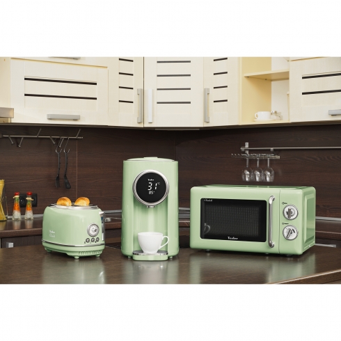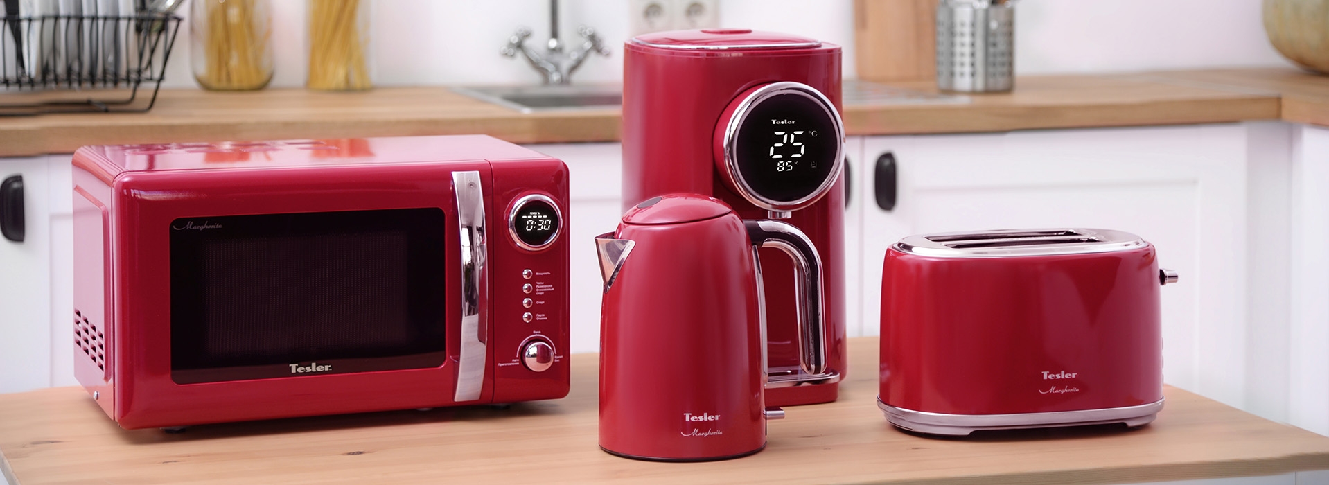 В комплект кухонной техники Tesler Margherita входят 4 устройства: СВЧ-печь, чайник, тостер и термопот.
