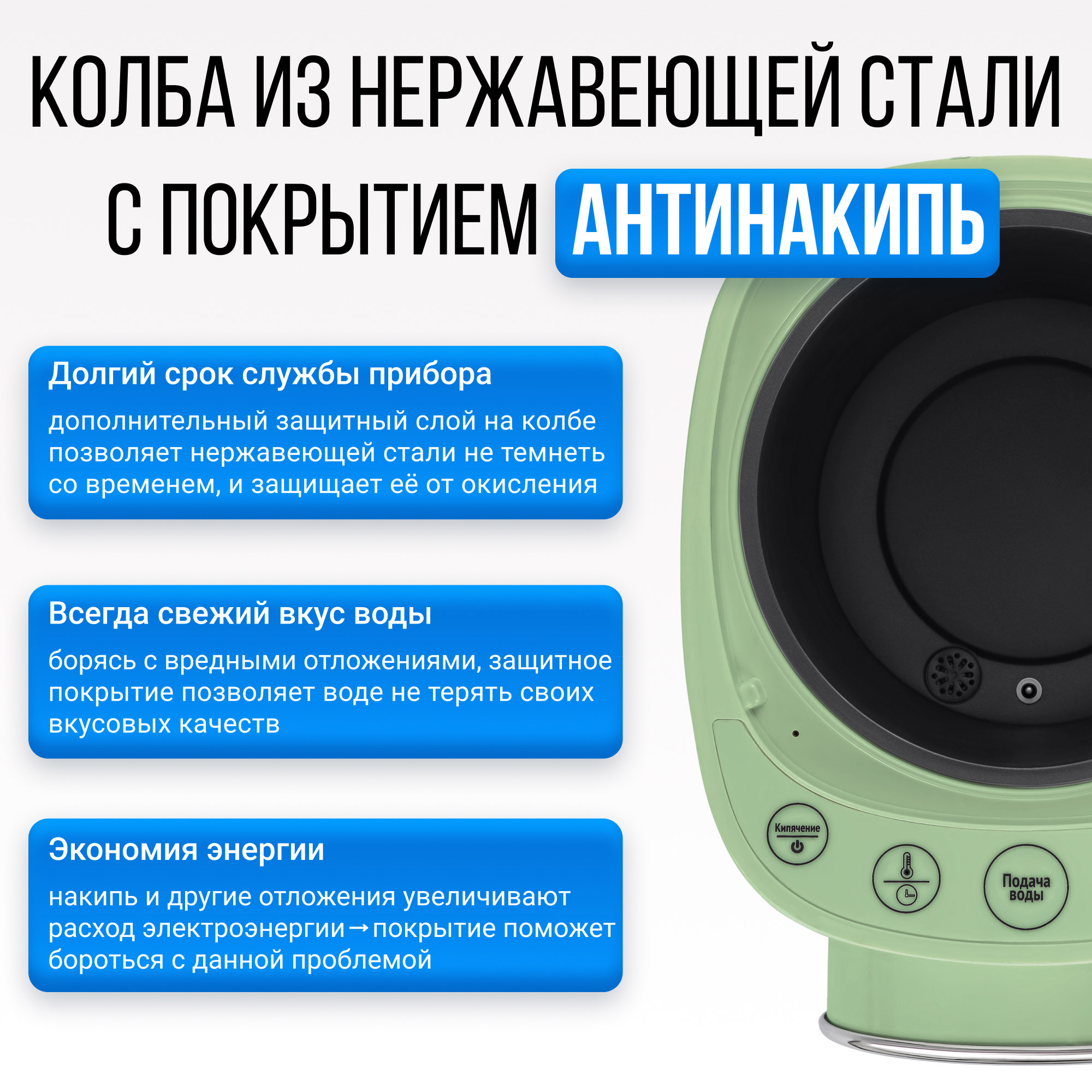• Внутренняя колба из нержавеющей стали со специальным покрытием, препятствующим образованию накипи и ржавчины.