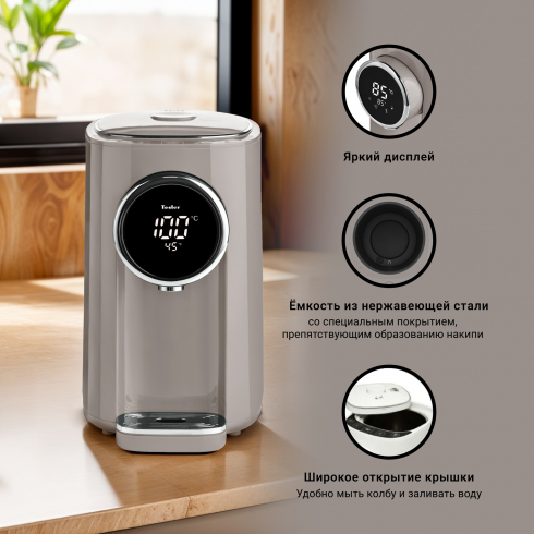 Термопот Tesler Margherita TP-5060 не только кипятит воду, но и нагревает её до одного из шести предустановленных значений (95, 85, 75, 65, 55, 45 градусов). Выбранная температура поддерживается постоянно.