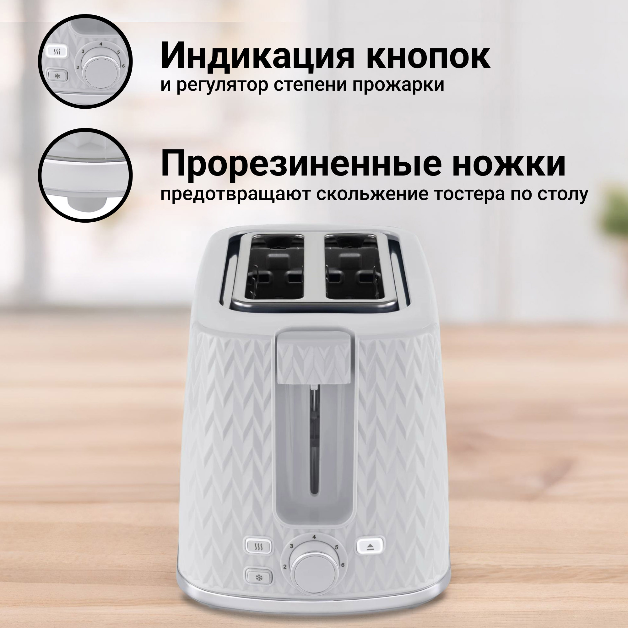 Тостер оснащён поворотным регулятором, который позволит установить предпочитаемую степень прожарки.