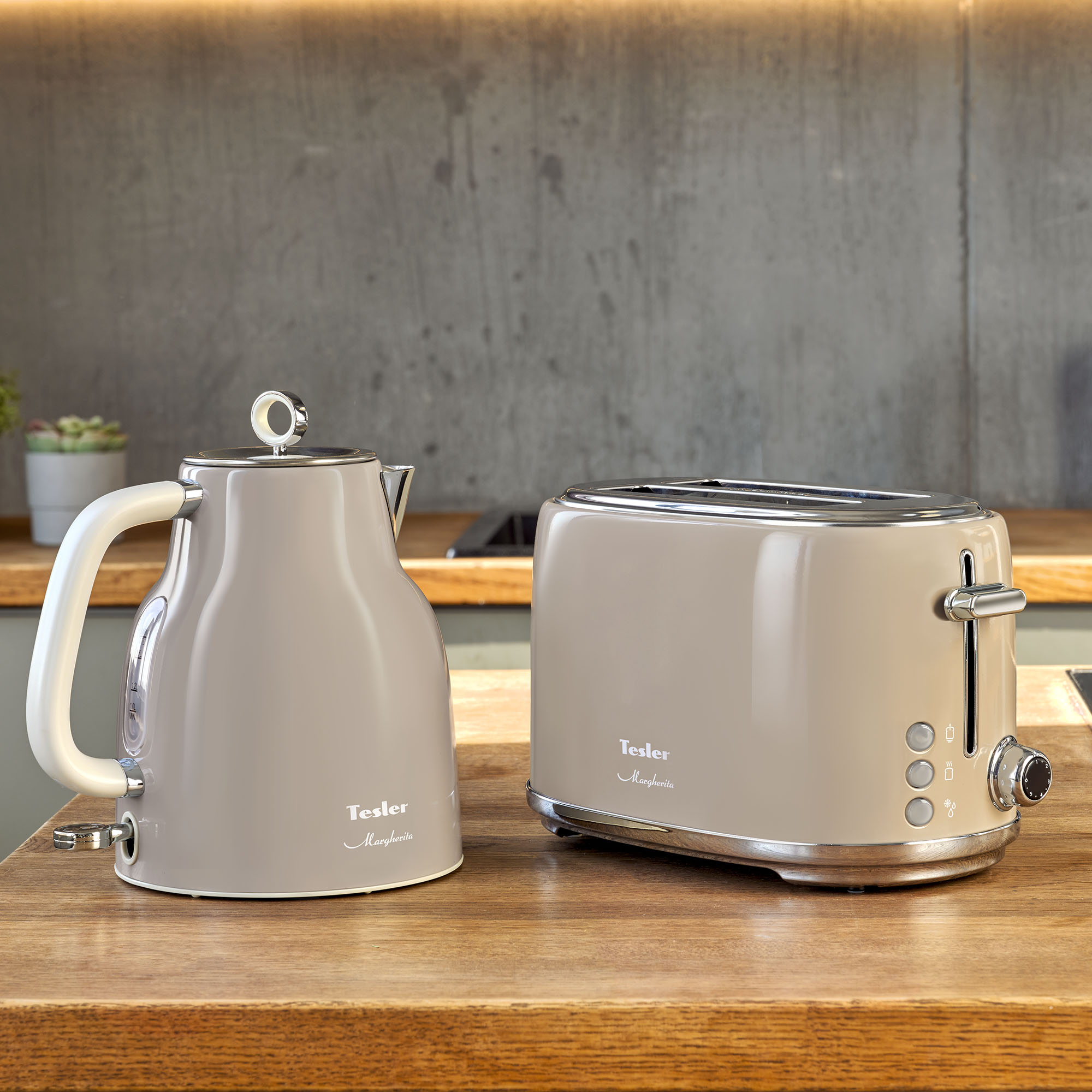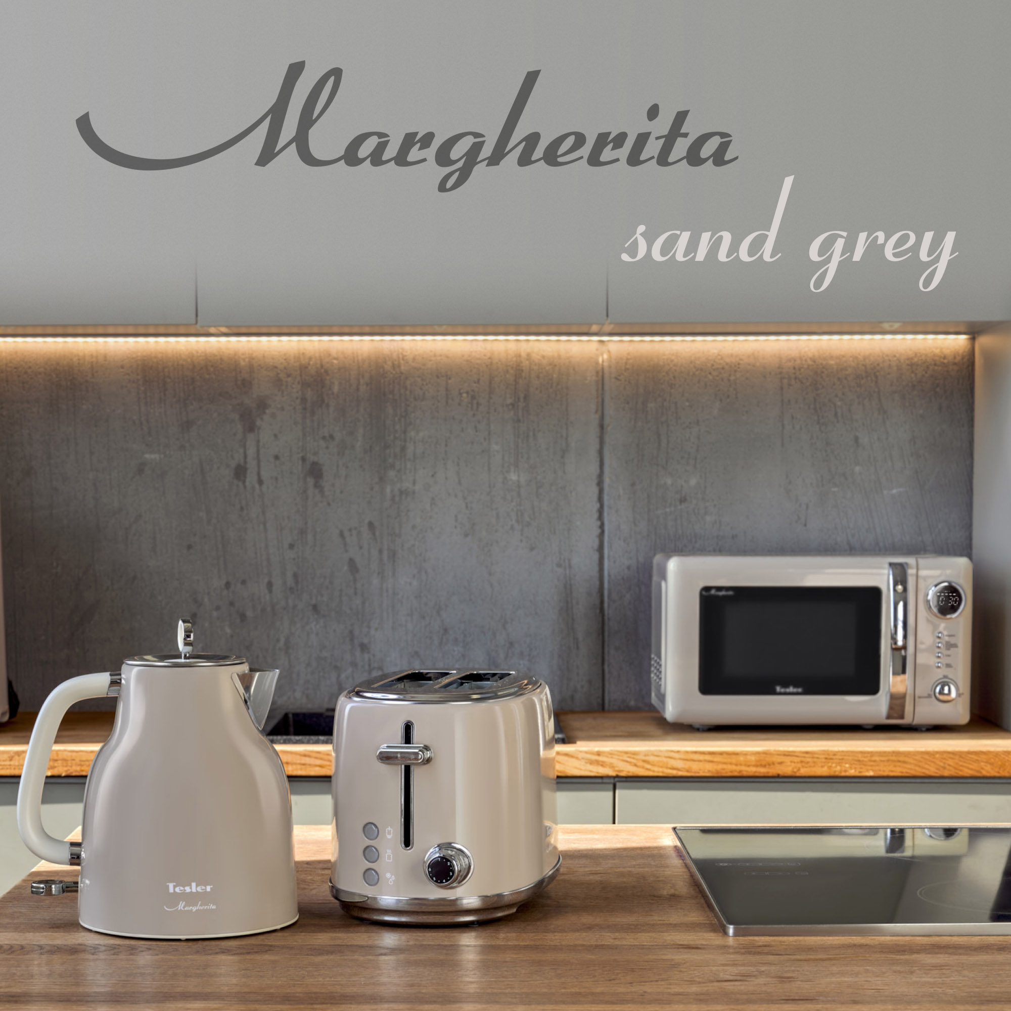 В комплект кухонной техники Tesler Margherita SAND GREY входят СВЧ-печь, чайник и тостер.