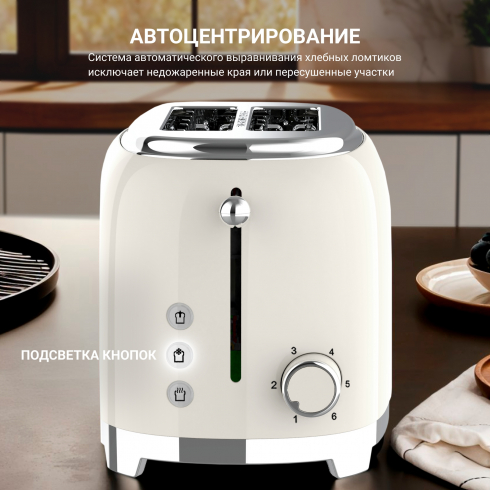 Функциональность модели включает возможность принудительной остановки процесса - тостер мгновенно прекращает работу по нажатию кнопки. Режим подогрева восстанавливает температуру готовых тостов, не изменяя выбранную степень обжарки, а алгоритм разморозки аккуратно приводит замороженный хлеб к мягкому состоянию и затем равномерно поджаривает его.