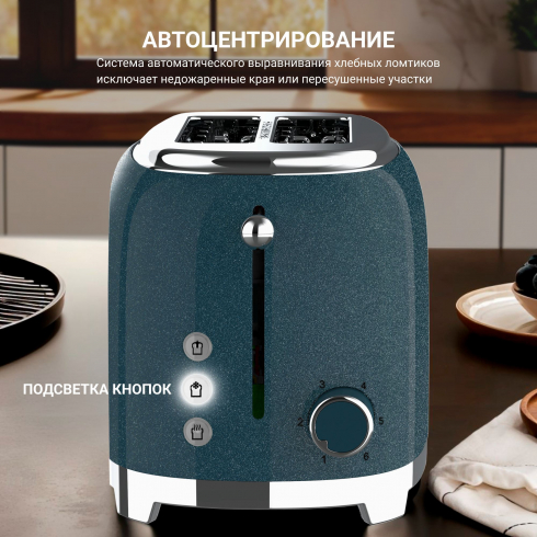 Управление сосредоточено на боковой панели со световой индикацией. Корпус из нержавеющей стали оснащён двумя отделениями с автоматическим центрированием ломтиков для равномерной прожарки, а система термозащиты и автоотключения обеспечивает безопасную работу устройства.