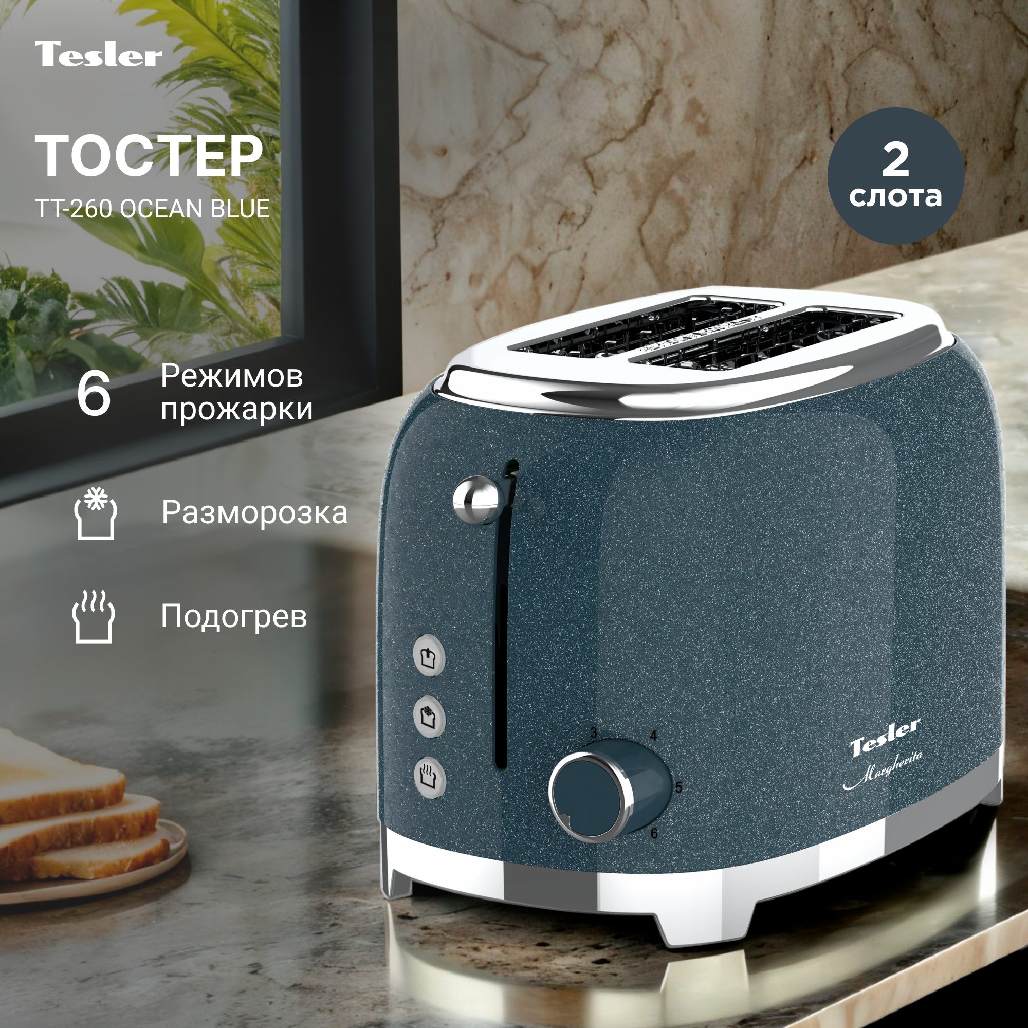 Модель Tesler TT-260 из линейки кухонных приборов Margherita сочетает в себе лаконичный дизайн с чистыми линиями и продуманную функциональность. Мощность 815 Вт обеспечивает ускоренное подрумянивание, мягкий подогрев и бережную разморозку хлеба.