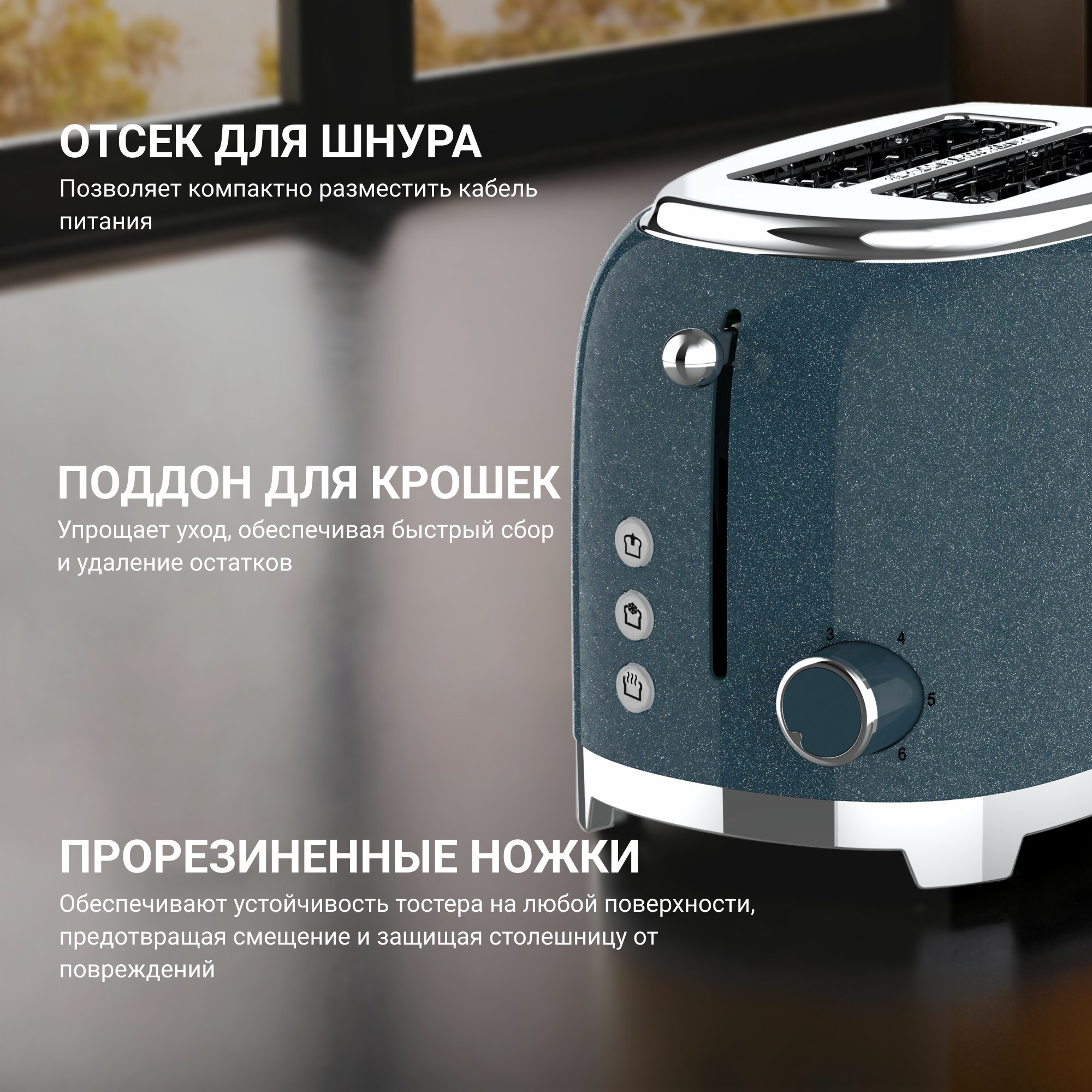 Удобен в повседневном использовании: поддон для крошек упрощает уход, антискользящие резиновые ножки обеспечивают устойчивость на любой рабочей поверхности, а специальный отсек позволяет компактно разместить кабель питания.