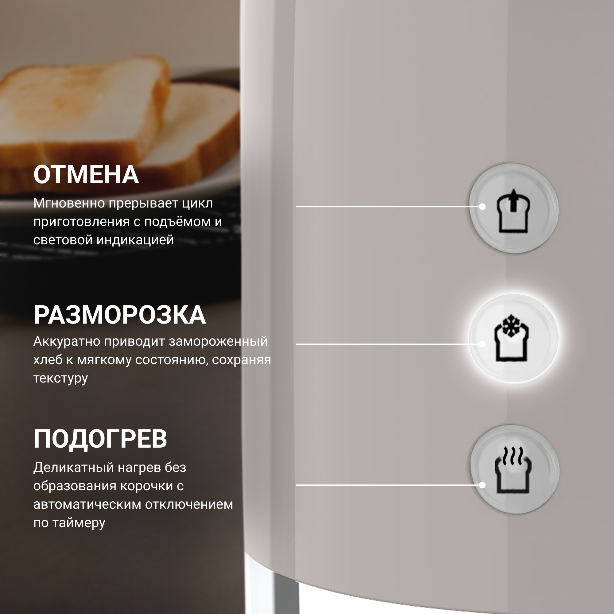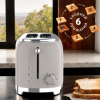 Функциональность модели включает возможность принудительной остановки процесса - тостер мгновенно прекращает работу по нажатию кнопки. Режим подогрева восстанавливает температуру готовых тостов, не изменяя выбранную степень обжарки, а алгоритм разморозки аккуратно приводит замороженный хлеб к мягкому состоянию и затем равномерно поджаривает его.