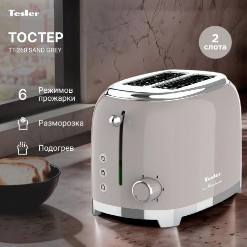 •  Tesler Margherita TT-260 на 2 слота изготовлен из высококачественных материалов: из окрашенной нержавеющей стали с хромированной рабочей поверхностью.