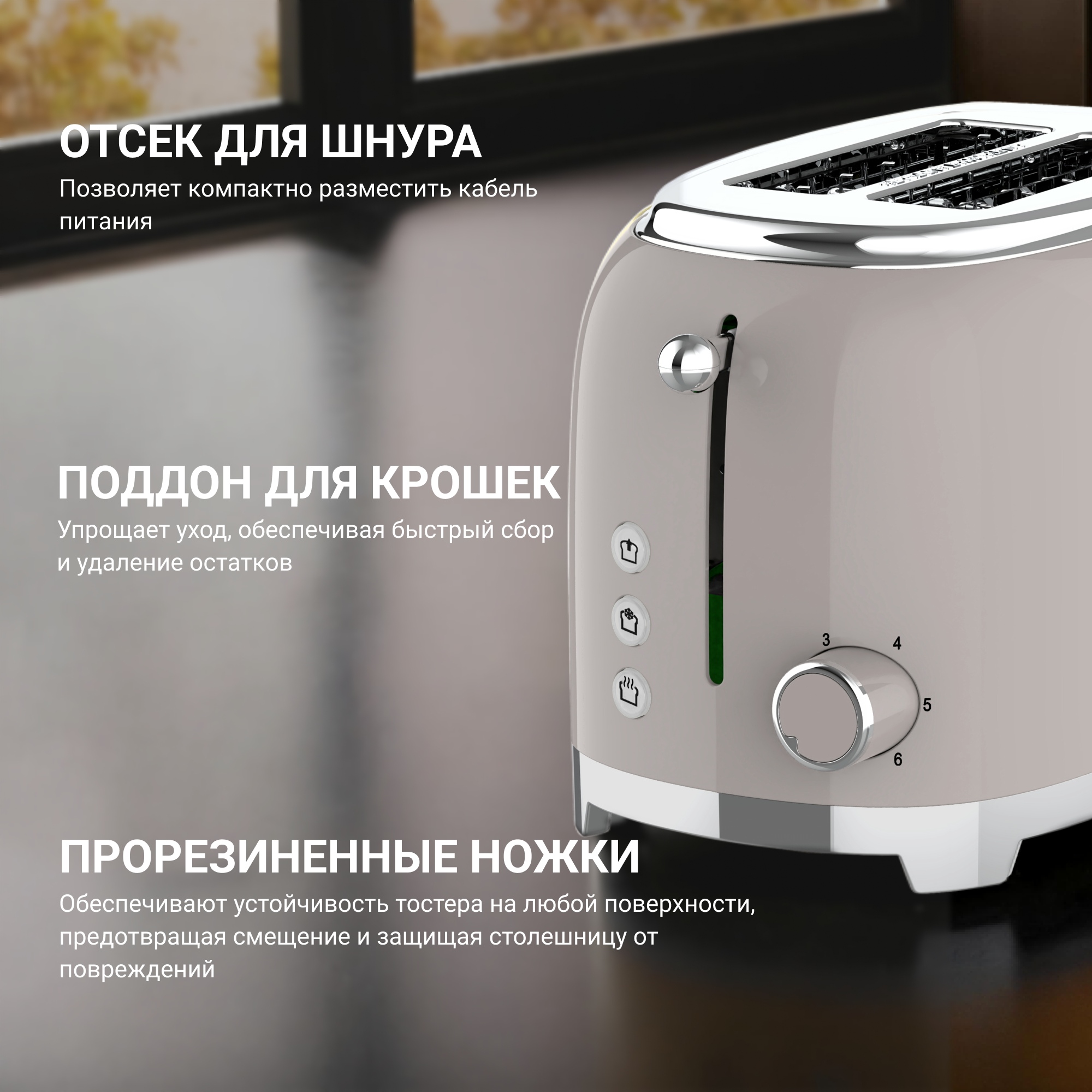 Удобен в повседневном использовании:  поддон для крошек упрощает уход, антискользящие резиновые ножки обеспечивают устойчивость на любой рабочей поверхности, а специальный отсек позволяет компактно разместить кабель питания.