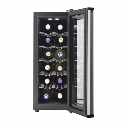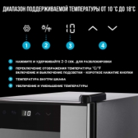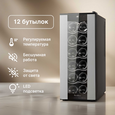 Винный шкаф Tesler WCV-120 на 12 бутылок обеспечит оптимальные условия, которые важны для сохранения качества и вкуса вина. Внутренняя температура регулируется с помощью сенсорного управления в диапазоне от 10 до 18 °C, что позволяет использовать его для хранения различных сортов вин.