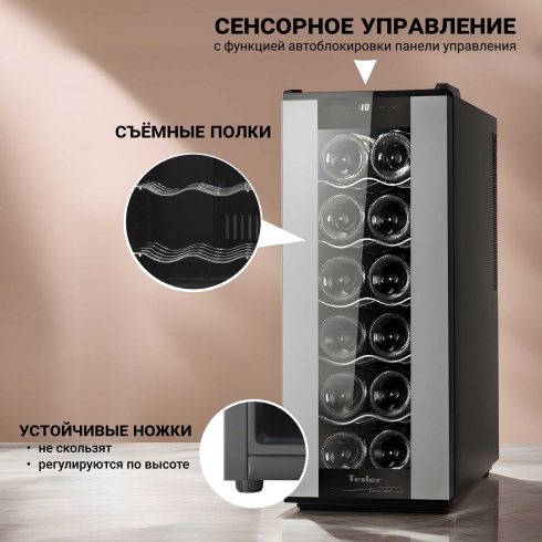 Благодаря элегантному дизайну и небольшим габаритам отдельностоящий винный шкаф Tesler WCV-120 легко впишется в интерьер городской квартиры, загородного дома или офиса. Разместить его можно на полу, столе или столешнице.