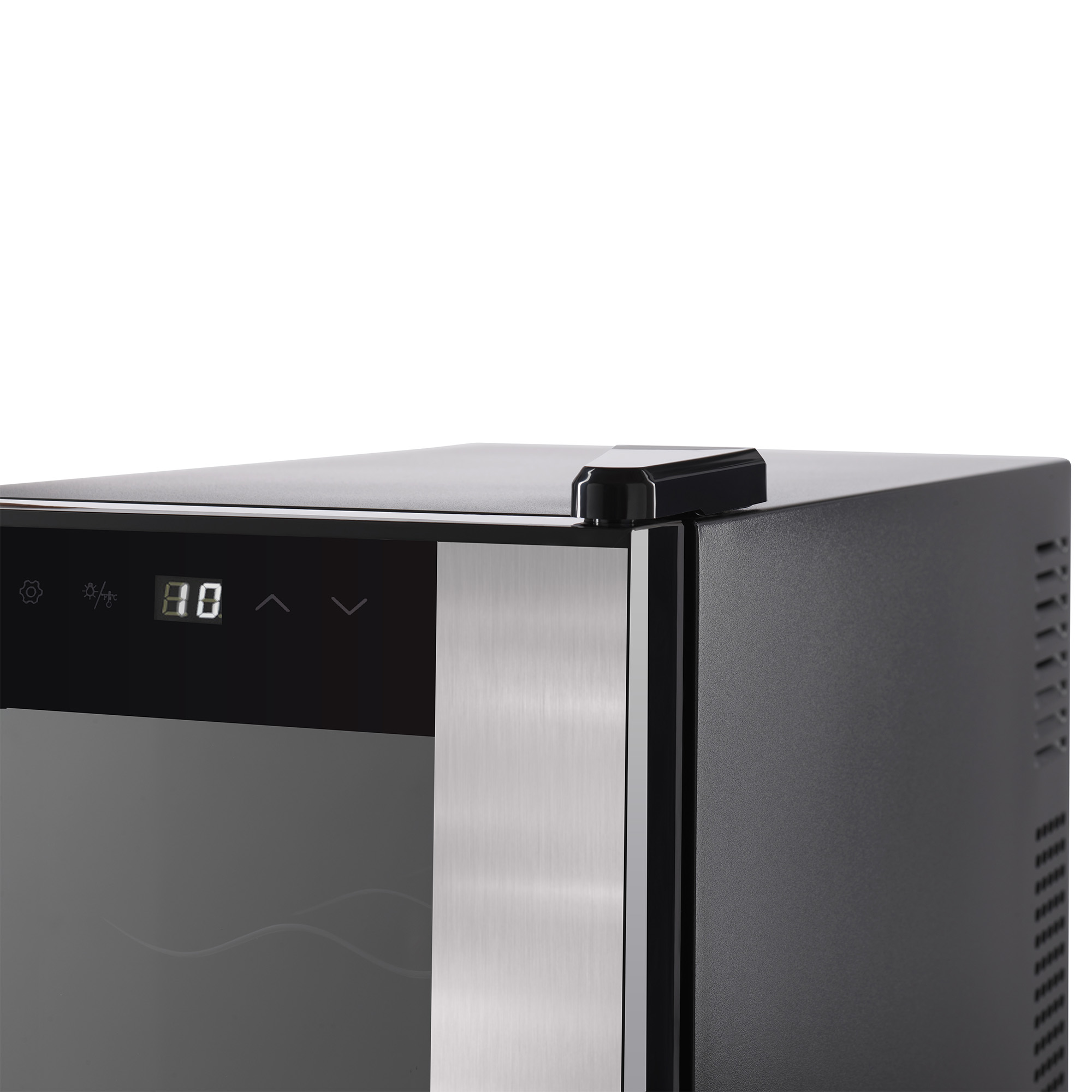 Дверца из двухслойного закалённого стекла с зеркальной поверхностью защитит напитки от воздействия света. При этом стекло позволяет увидеть содержимое, не открывая дверцу. Для этого достаточно просто включить подсветку.