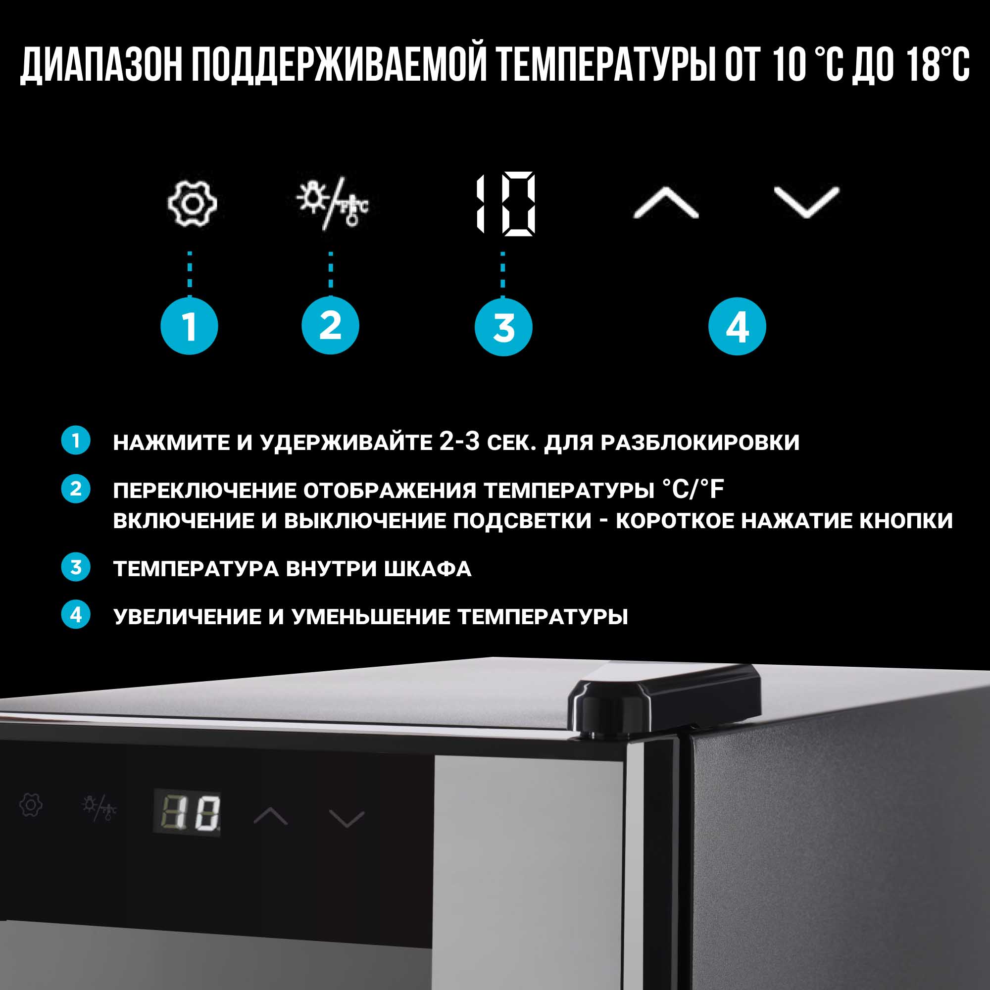 LED-дисплей с белой индикацией отображает температуру внутри, а изменить её можно с помощью сенсорных кнопок, расположенных рядом. Панель управления автоматически блокируется после последнего взаимодействия.