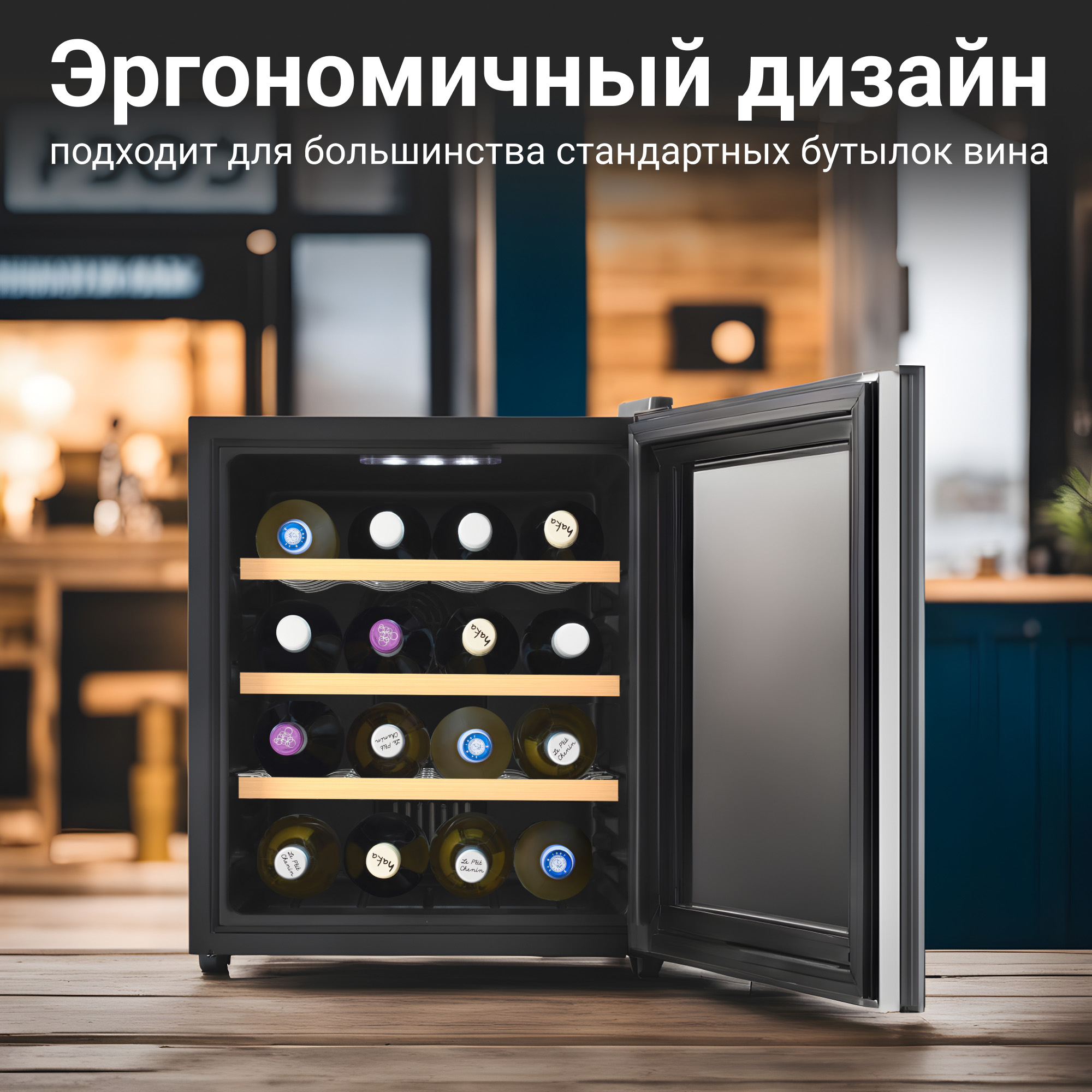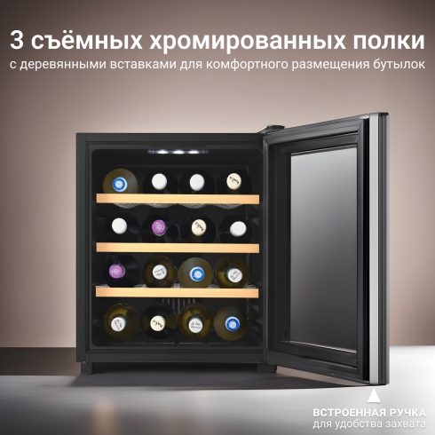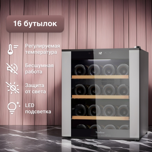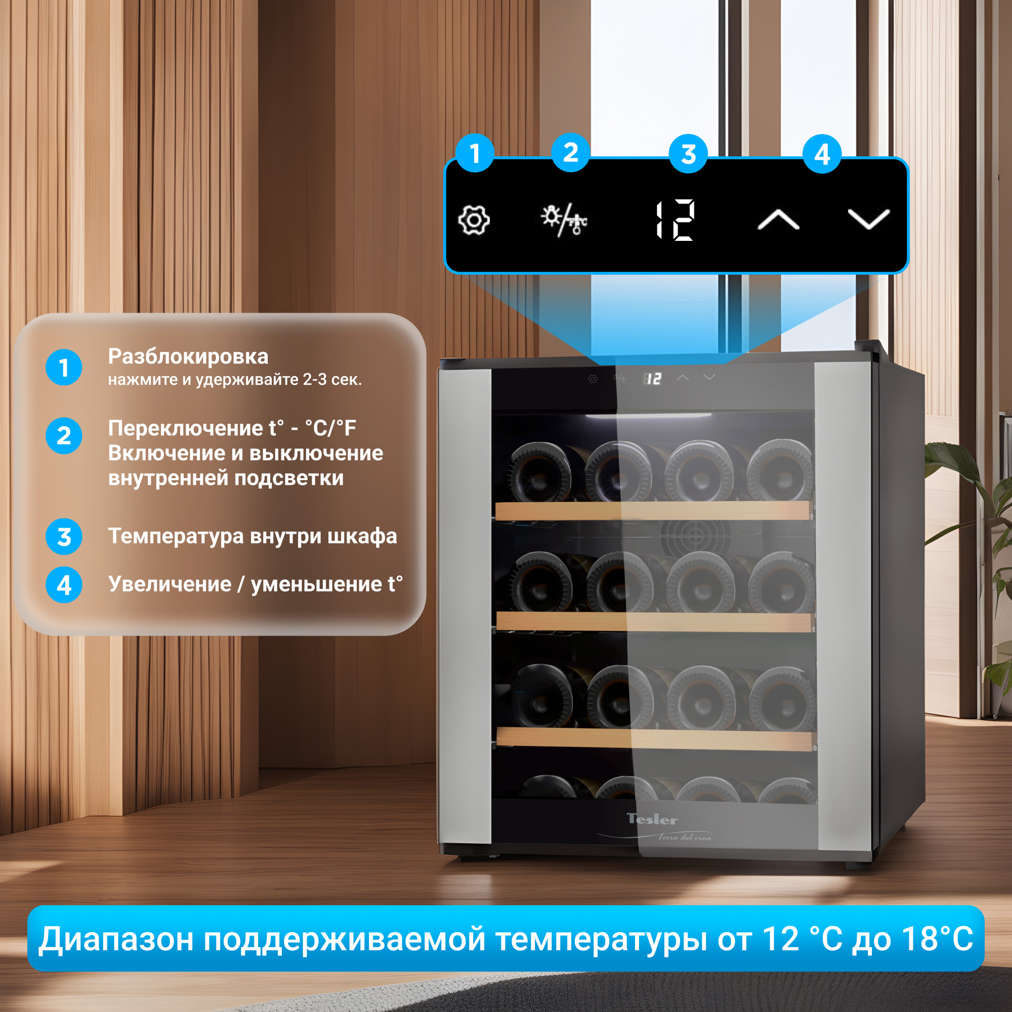 Отдельностоящий винный шкаф на 16 бутылок Tesler WCV-160 обеспечит оптимальные условия, которые важны для сохранения качества и вкуса вина. Внутренняя температура регулируется с помощью сенсорного управления в диапазоне от 12 до 18 °C, что позволяет использовать его для хранения различных сортов вин. 3 хромированные полки с деревянной планкой позволят с комфортом разместить все бутылки.