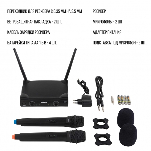 В комплекте: микрофон (2), ресивер, переходник для ресивера (Jack 6,3 - 3,5mm), кабель зарядки ресивера (USB - micro USB), элемент питания АА 1,5В (4), ветрозащитная накладка (2), подставка под микрофон (2)