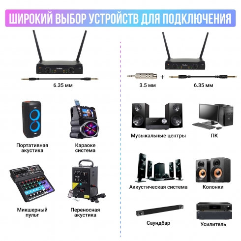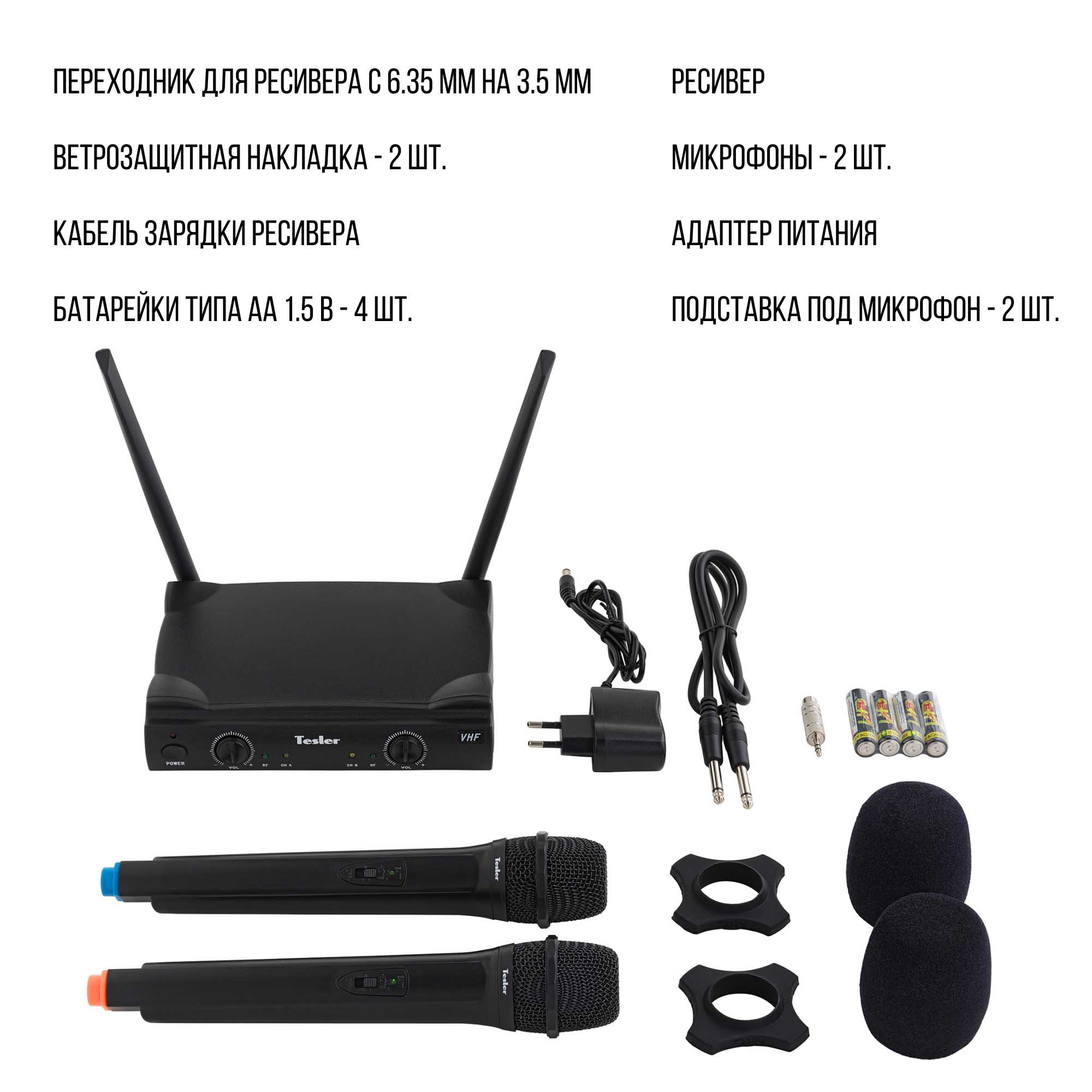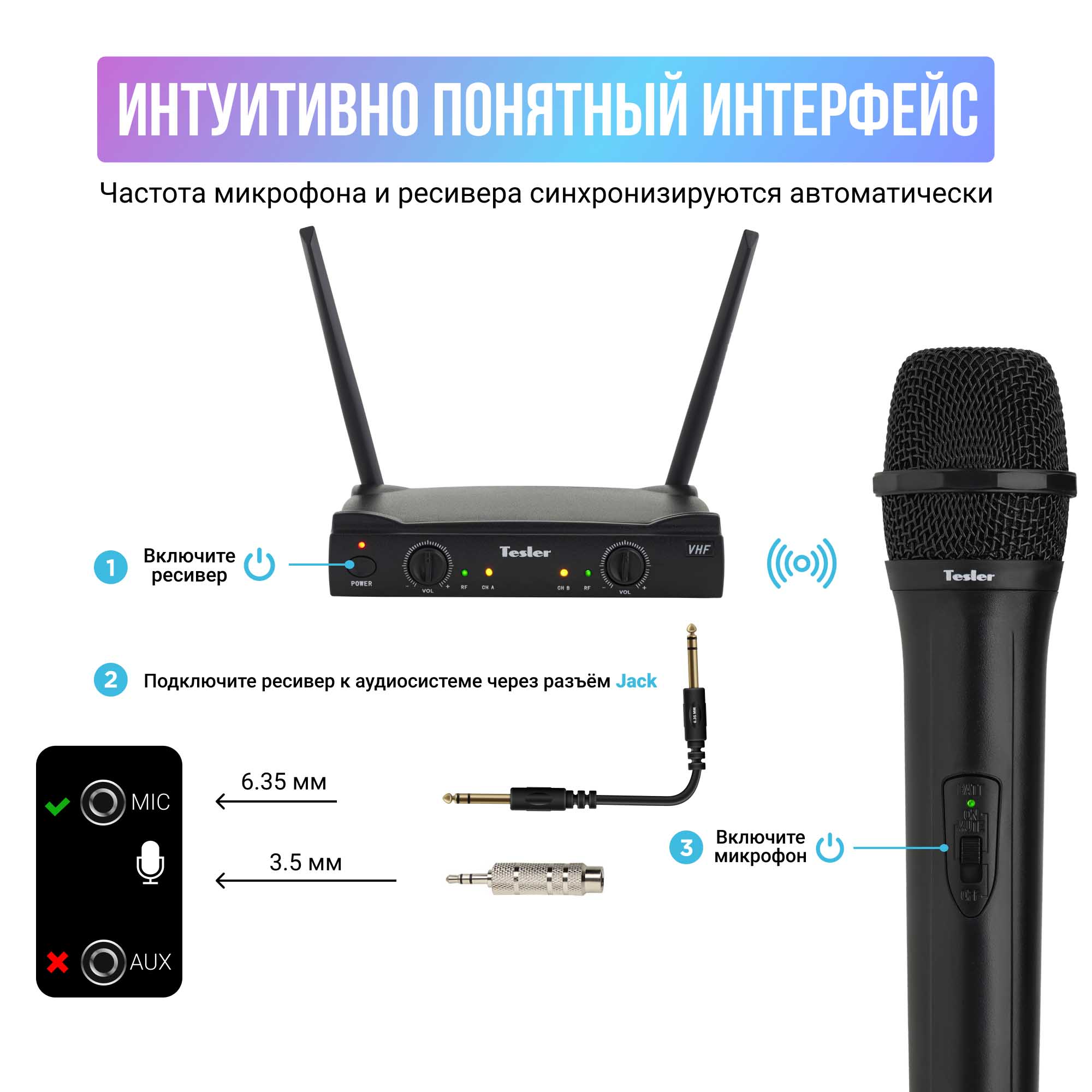 Представляем вашему вниманию комплект из двух динамических микрофонов и приёмника радиосигнала Tesler WMS-320. Эта беспроводная вокальная система прекрасно подойдет для проведения праздников, банкетов, деловых мероприятий и домашнего использования. Просто подключите ресивер к вашей аккустической системе и установите сопряжение посредством нажатия кнопки "Вкл". Готово! Проще не придумаешь.