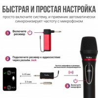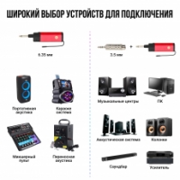 Вы можете подключить приёмник сигнала в разъем усилителя, микшерного пульта или эквалайзера, и в два простых действия установить соединение. Частота микрофона и ресивера автоматически синхронизируются.