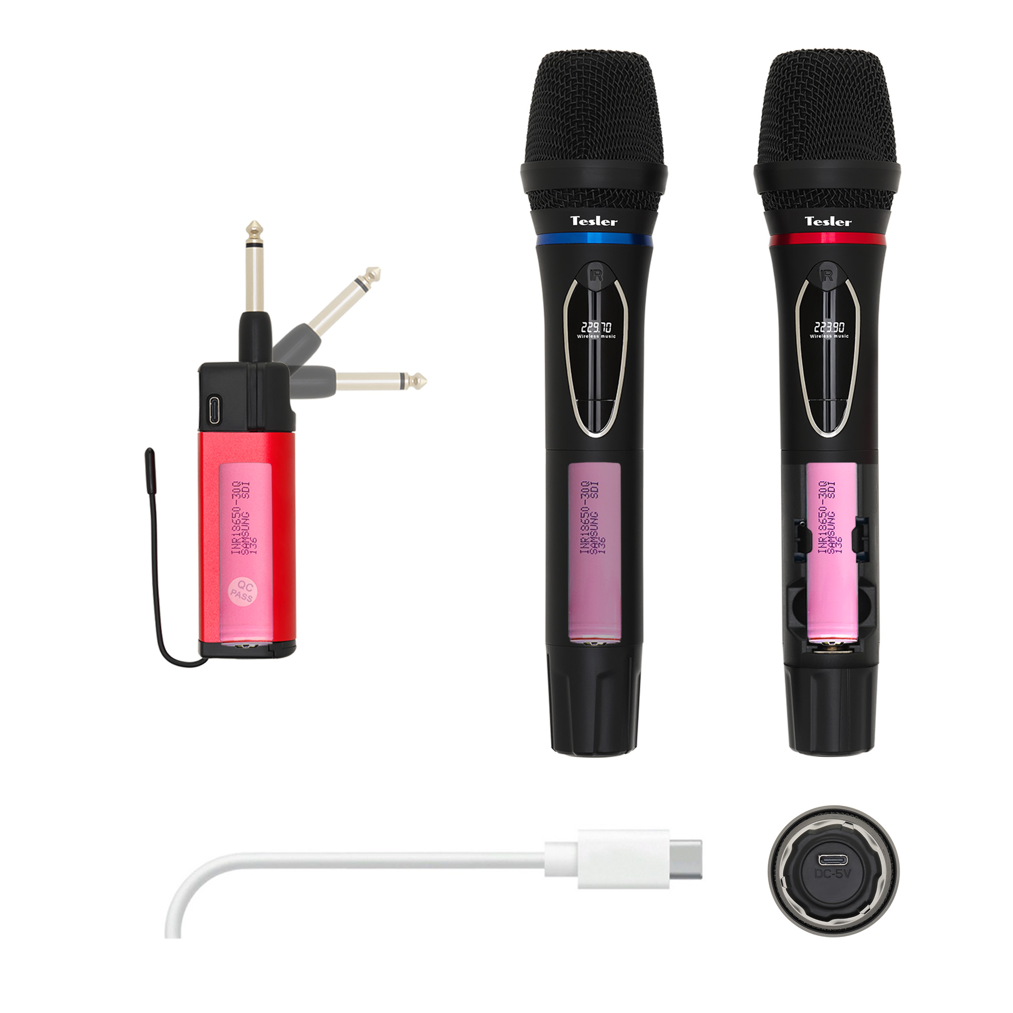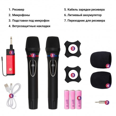 В комплекте: микрофон (2), ресивер, переходник для ресивера (Jack 6,3 - 3,5mm), кабель зарядки ресивера (USB - micro USB), элемент питания - литиевый аккумулятор 18650 (3), ветрозащитная накладка (2), подставка под микрофон (2)